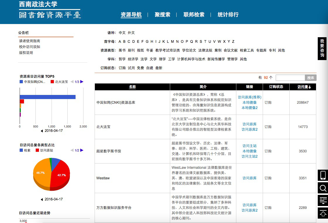 提供電子資源庫的使用統計分析,包括訪(fǎng)問(wèn)量排行統計、趨勢統計、占比統計,全文下載量統計,以及用戶(hù)訪(fǎng)問(wèn)量統計??缮删赖慕y計圖表,便于館員掌握資源庫的使用情況,可為資源的評估提供參考依據。每天生成資源庫的日訪(fǎng)問(wèn)量統計,前端自動(dòng)更新相應圖表,目前展現有“資源庫日訪(fǎng)問(wèn)量TOP”、“日訪(fǎng)問(wèn)總量各類(lèi)型占比”、“日訪(fǎng)問(wèn)總量近期走勢”,美觀(guān)實(shí)用。
