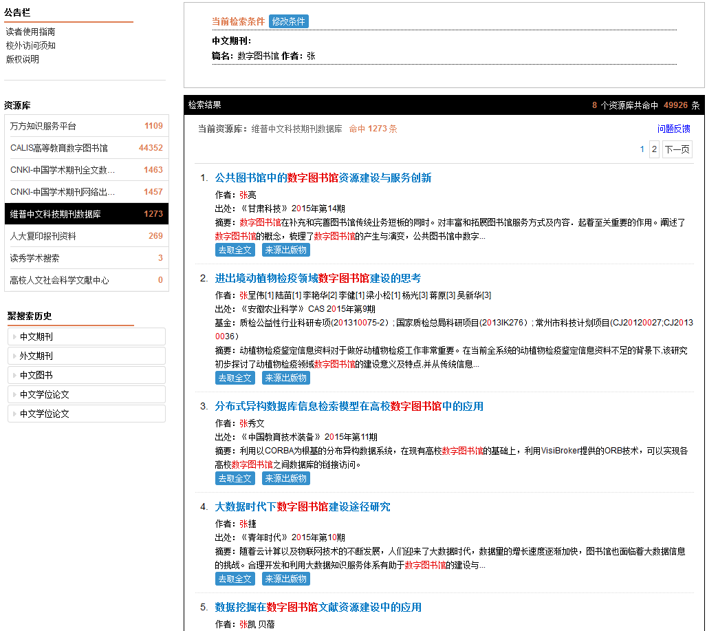 提供強大的一站式統一檢索,不僅可整合知名廠(chǎng)商的數據庫,還可以整合圖書(shū)館的館藏目錄、自建特色資源以及一些廠(chǎng)商提供的本地鏡像庫。聚搜索功能將圖書(shū)館重要常用的核心資源庫整合在特定專(zhuān)題類(lèi)目中,師生直接選擇相應類(lèi)目進(jìn)行多字段組合檢索,可以精確定位特定文獻,同時(shí)支持OPENURL/DOI查找。通過(guò)輕量級的聚類(lèi)檢索架構,將圖書(shū)館核心的20%的電子資源庫整合起來(lái)統一檢索,滿(mǎn)足讀者80%的文獻檢索需求,服務(wù)將更加精準,更加高效。