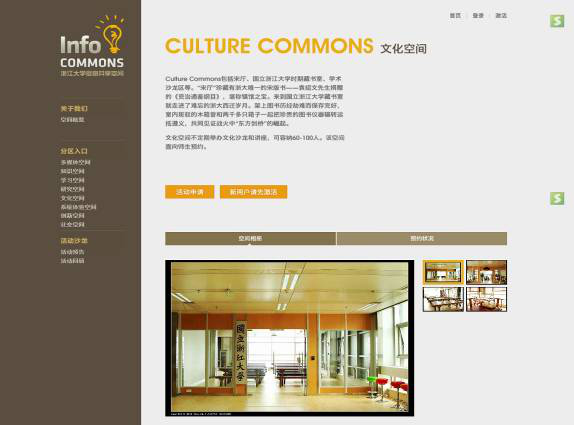 針對圖書(shū)館的IC空間的管理,專(zhuān)業(yè)的門(mén)戶(hù)網(wǎng)站,包括對各類(lèi)房間的介紹,相關(guān)設備的介紹,以及和學(xué)生的互動(dòng)界面等,如下圖所示: