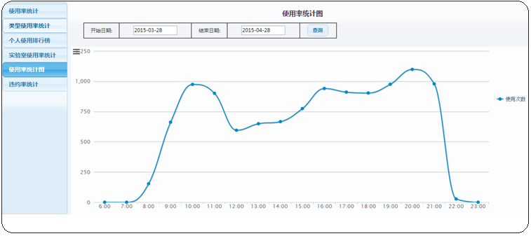 系統提供完善的報表統計功能,圖書(shū)館可根據需要查詢(xún)到相應的座位系統使用數據的統計信息,如查詢(xún)全部座位的使用率統計、區域座位的使用率統計、座位使用排行、違約率統計、使用人數、使用人次、使用總時(shí)長(cháng)等,系統并自動(dòng)根據使用數據繪制出曲線(xiàn)圖,可根據曲線(xiàn)圖直觀(guān)了解每個(gè)時(shí)段座位的使用量大小。