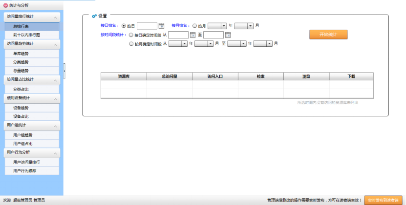 點(diǎn)擊菜單【統計與分析>>訪(fǎng)問(wèn)量排行統計>>總排行表】,打開(kāi)總排行表的設置頁(yè)面。統計的時(shí)間范圍設置非常靈活,可以具體到某一天,可以是某一個(gè)月,即按日排名和按月排名。支持按時(shí)間段統計排名,可以按日確定時(shí)間段,也可以按月確定時(shí)間段。按日確定時(shí)間段滿(mǎn)足了各種不是整月整年的時(shí)間范圍統計,而按月確定時(shí)間段能滿(mǎn)足整月、半年、一年,或者是幾年的統計時(shí)間范圍的需求。