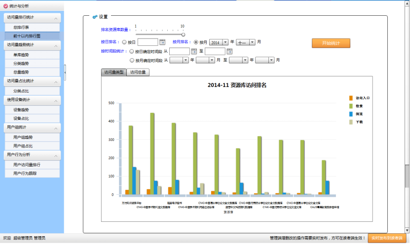排行統計突出資源庫訪(fǎng)問(wèn)量的排名,目前分為兩種統計圖表:總排行表和TOP-N(N小于等于10)的排行圖。