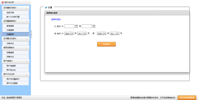 點(diǎn)擊菜單【統計與分析>>訪(fǎng)問(wèn)量趨勢統計>>單庫趨勢】,打開(kāi)單庫趨勢圖的設置頁(yè)面(如下圖)。