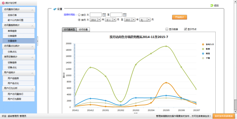 趨勢統計重點(diǎn)表現資源庫訪(fǎng)問(wèn)量隨時(shí)間周期的趨勢走勢,目前分為三種統計圖表:?jiǎn)螏熠厔輬D、分類(lèi)趨勢圖和總量趨勢圖。