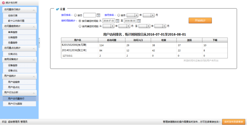 點(diǎn)擊菜單【統計與分析>>用戶(hù)行為分析>>用戶(hù)訪(fǎng)問(wèn)量排行】,打開(kāi)用戶(hù)訪(fǎng)問(wèn)量排行表的設置頁(yè)面。用戶(hù)訪(fǎng)問(wèn)量排行可以詳細了解每一位用戶(hù)的總訪(fǎng)問(wèn)量,并且可以了解其檢索和下載等行為的次數。查看排行時(shí),選擇相應的時(shí)間段即可統計(如下圖)。